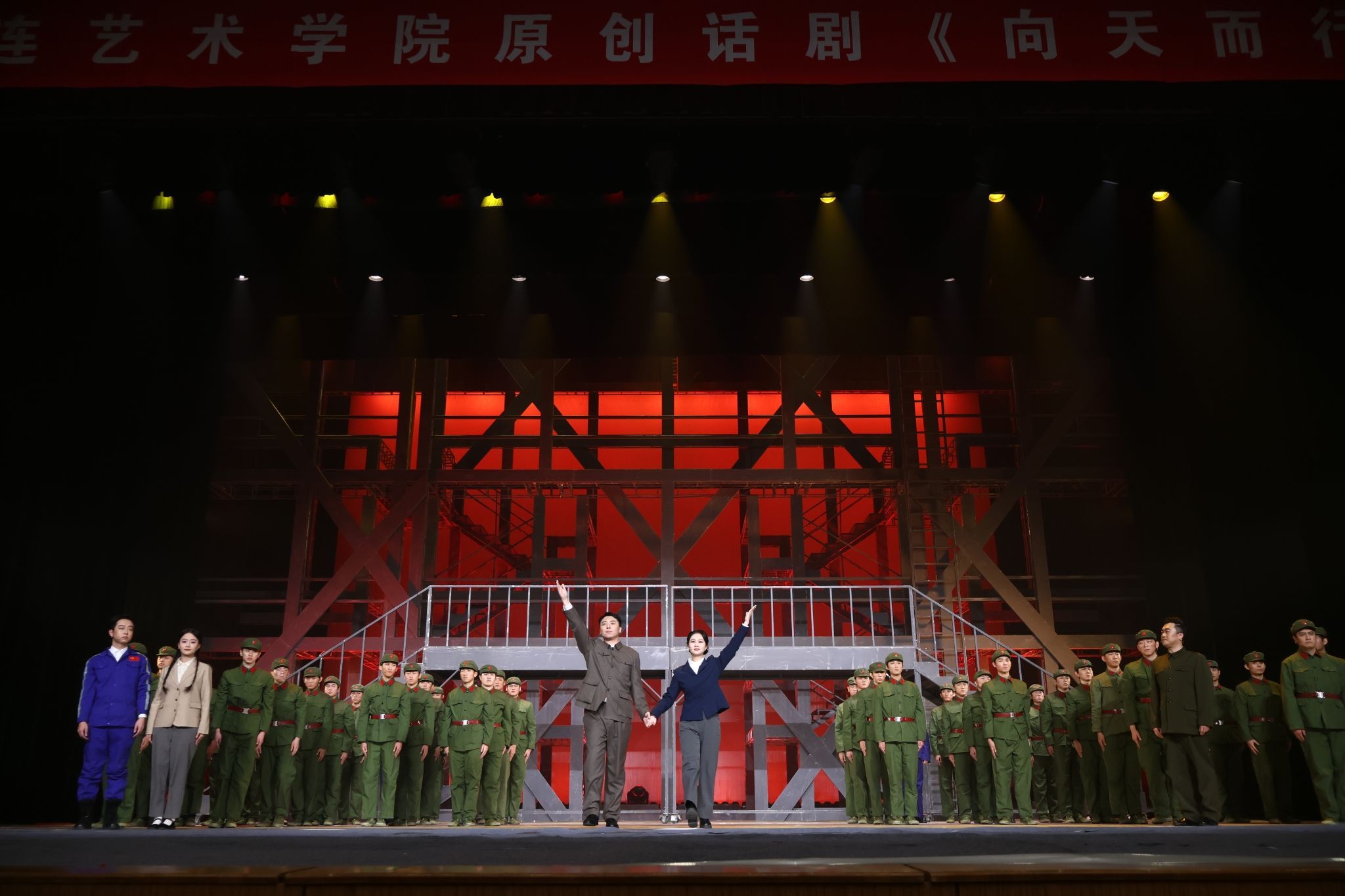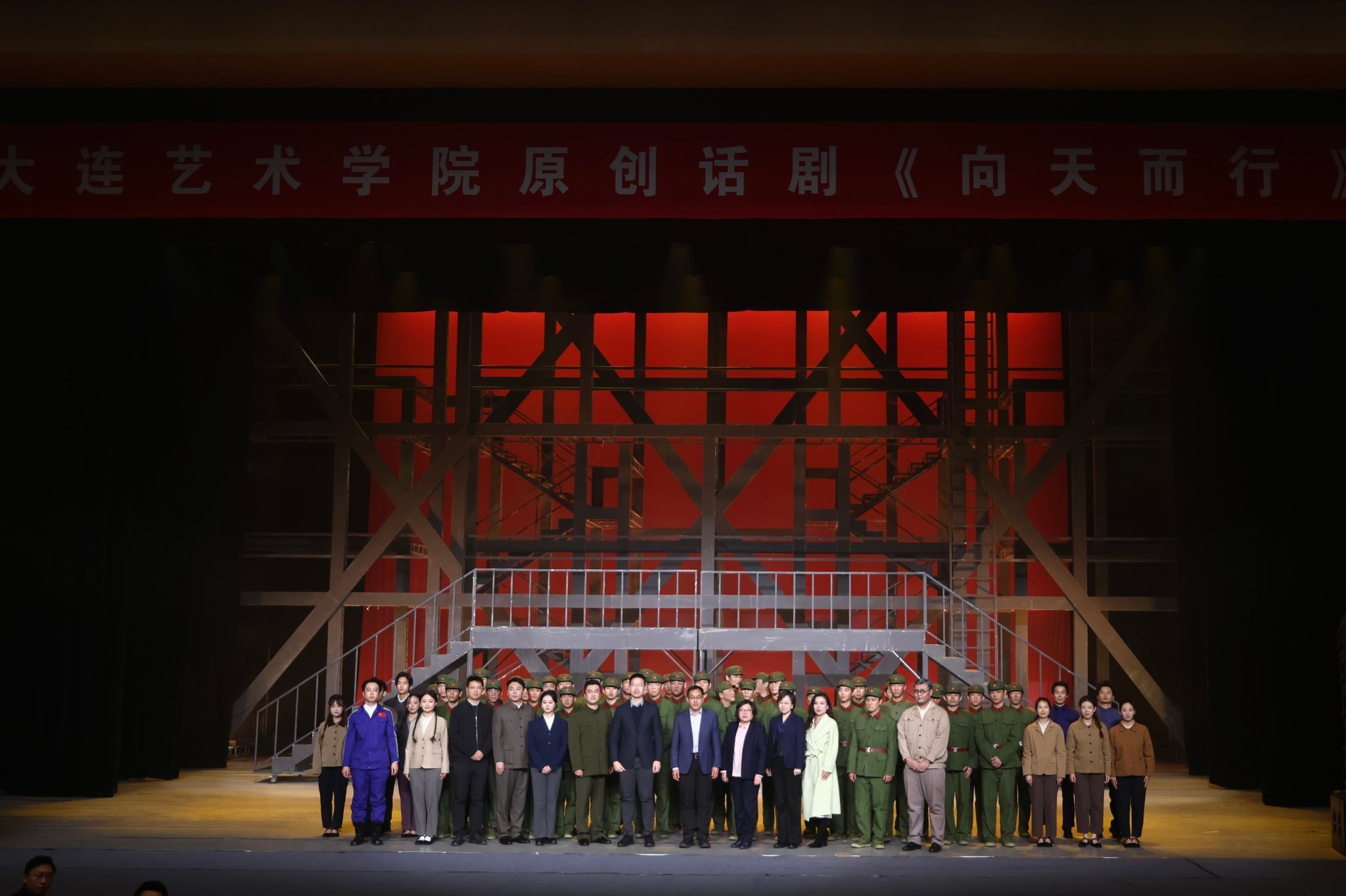 12月12日、13日晚,大连艺术学院原创话剧《向天而行》在我校学生文化中心剧场成功上演。我校党委副书记、副校长张言军,大连艺术学院党委书记王晶,副校长李君与师生一同观演。话剧《向天而行》以我国“两弹结合”试验成功这一重大历史事件为背景,通过一对知识分子夫妇隐姓埋名、奉献戈壁的动人故事,以“一份档案”“一次离别”“一顿晚饭”“一声啼哭”“一次重逢”“一生无悔”命名,艺术再现了老一辈航天人艰苦卓绝的奋斗历程,深刻诠释了“热爱祖国、无私奉献,自力更生、艰苦奋斗,大力协同、勇于攀登”的“两弹一星”精神。