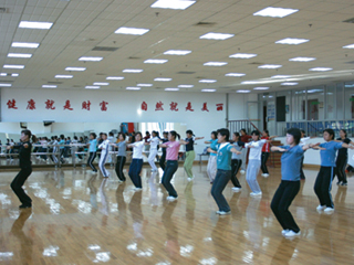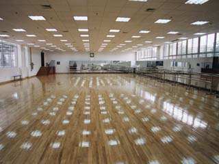 健美操馆面积 400 平方米 , 地面铺设优质地板,配有电视、音响、地毯、镜子、把杆、领操台以及多种健美操器材,是健美操教学和训练的理想场所。